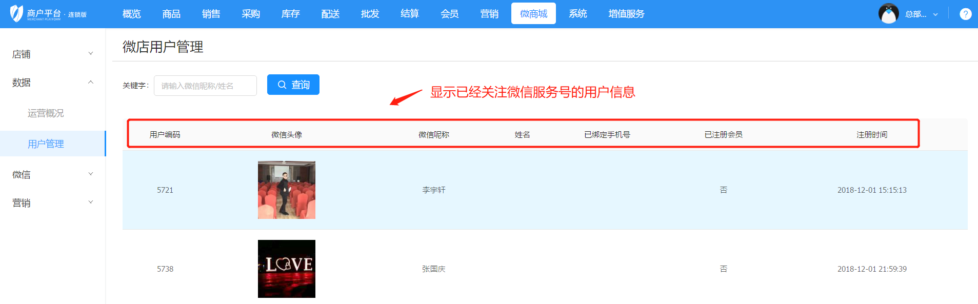 3)用戶管理:顯示已經(jīng)關(guān)注微信服務(wù)號(hào)的用戶,分別顯示微信頭像、昵稱、姓名、已綁定的手機(jī)號(hào)、是否已注冊(cè)會(huì)員、注冊(cè)時(shí)間等。