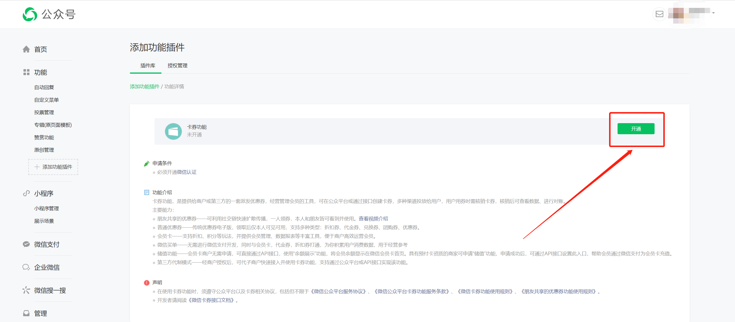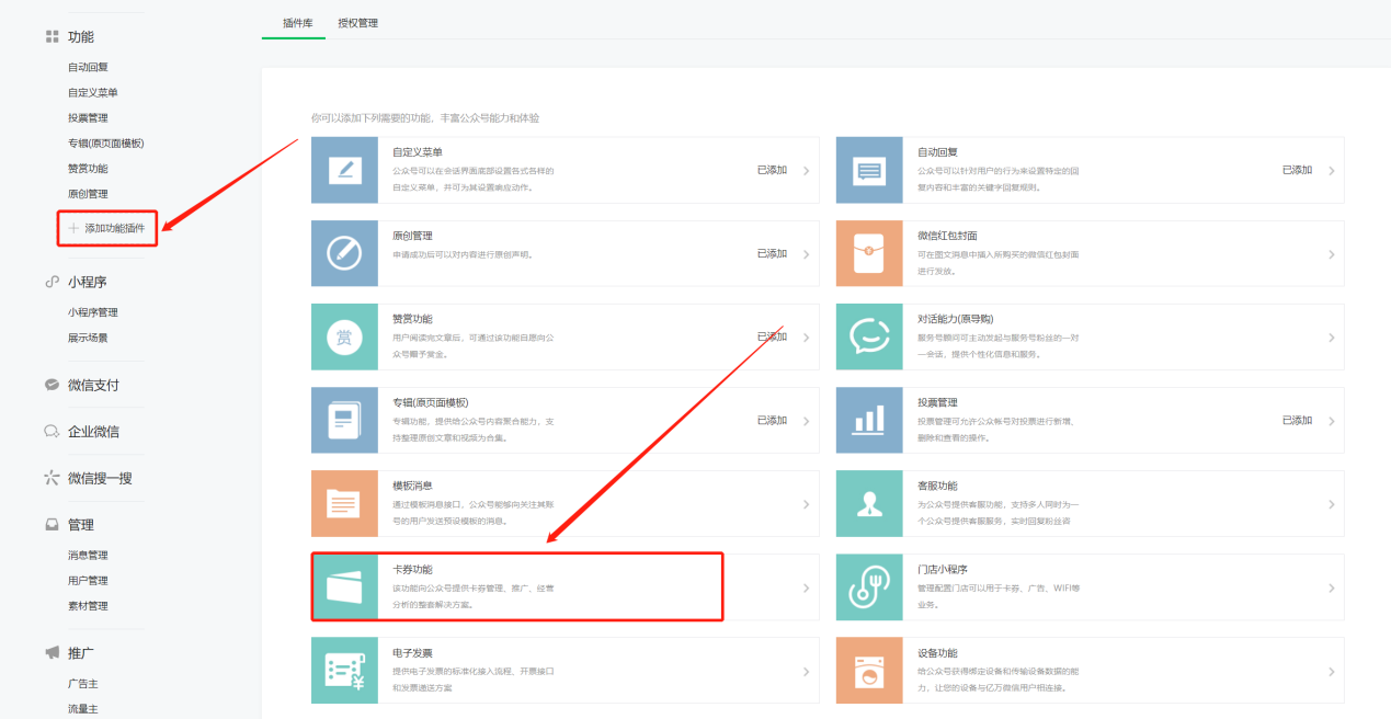 ① 左側菜單欄【添加功能插件】,選擇卡券功能,申請