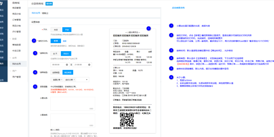 主要使用場景是:消費者在小程序上購物,收銀臺自動接收訂單,有聲音提醒,易聯云打印機自動打印小票。