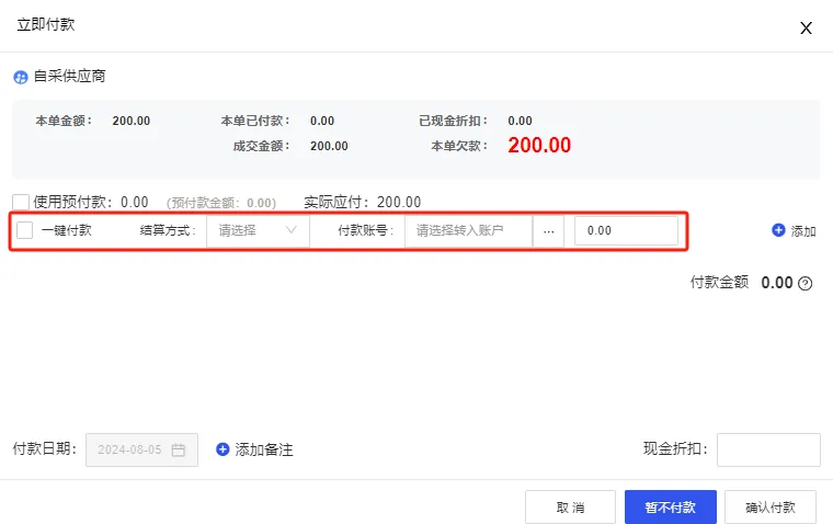 當采購商品入庫時,商戶可以選擇一鍵完成付款,或者使用預付款進行結賬。